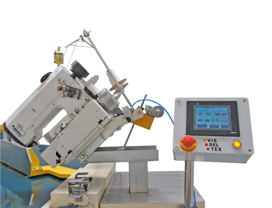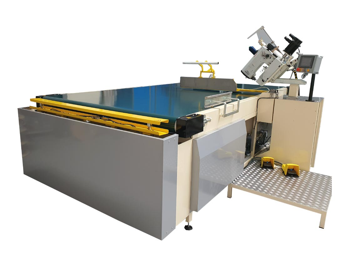 Máquina diseñada para el cerrado perimetral de colchones, equipada con cabezal PFAFF 5625 y mesa de transporte con brazo de giro y volteador. Su cabezal ajustable en altura permite adaptarse a distintos grosores de colchón. Dispone de pantalla táctil con interface intuitivo para el control de parámetros y velocidad de costura, especialmente útil en las esquinas.